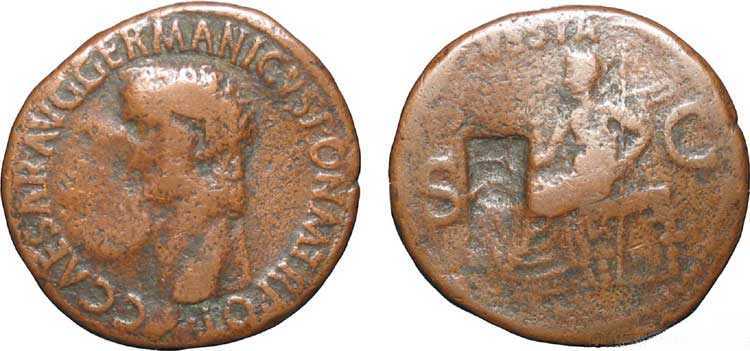 "TIB CLAIMP" in ligature on Germanicus As of Caligula, the countermark is from Claudius (countermark Martini Pangerl Collection 51)