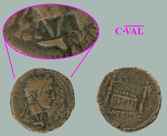 This attribution of "C VAL" to Numonius Vala is however not based on solid evidence. On coins with both "VAR" and "CVAL" countermarks "CVAL" has been applied before "VAR", and of course, "VAR" is not confirmed for Varus either (see that section).