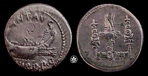 Bull/dolphin, and Galley, other side Emperor's head, see also Countermark