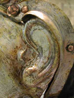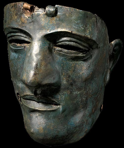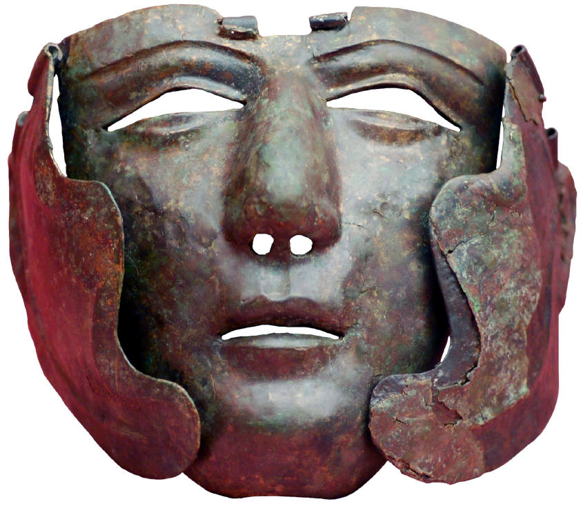 Face mask of type Kalkriese with two preserved cheekpieces. Both mask and cheekpieces executed in iron (base plate) and brass (cover sheet). This combination clearly was part of a cavalry type helmet (Weiler or Weisenau). This is supported by the shape and profile of the cheekpieces which feature an ear-protection. The best comparison is a complete brass Weisenau helmet with a similar type of mask and cheekpieces in the Shelby White collection in NY.