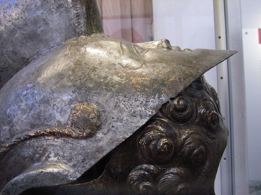 Face mask of the type Nimegen Kops-Plateau. Massive iron base plate with brass cover sheet. Partially retaining its silvered (tinned) surface. Belongs to a Weiler type cavalry helmet. Please compare to examples found in the Netherlands (Nijmegen) and France.