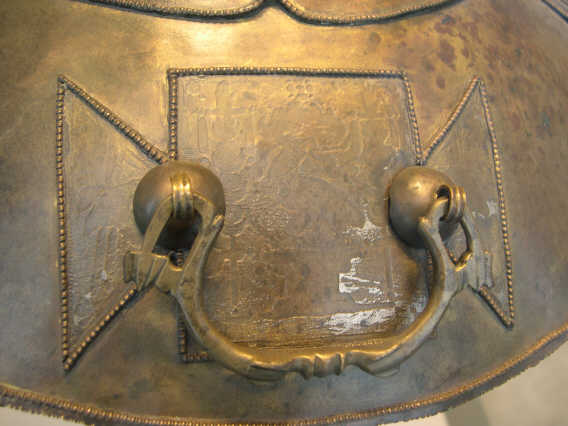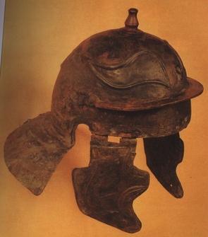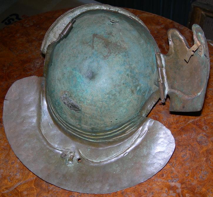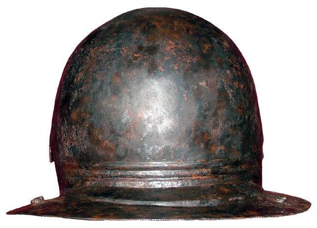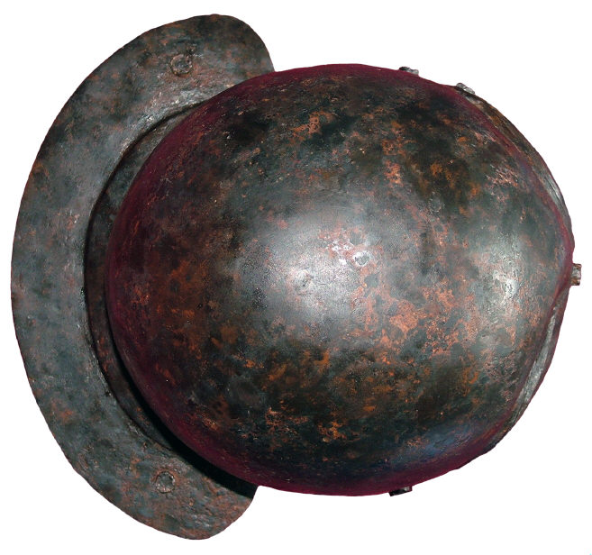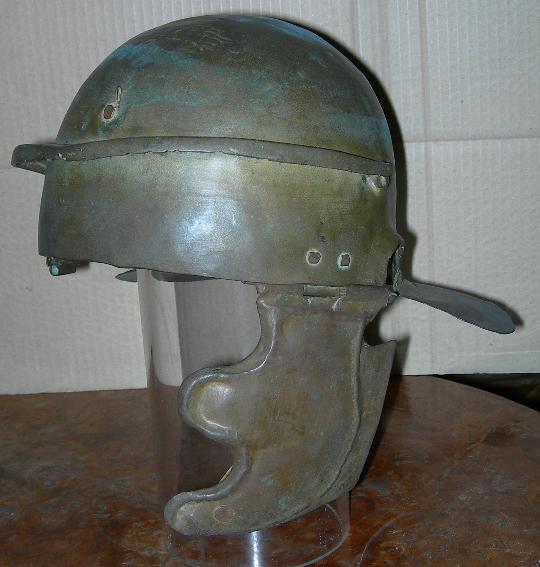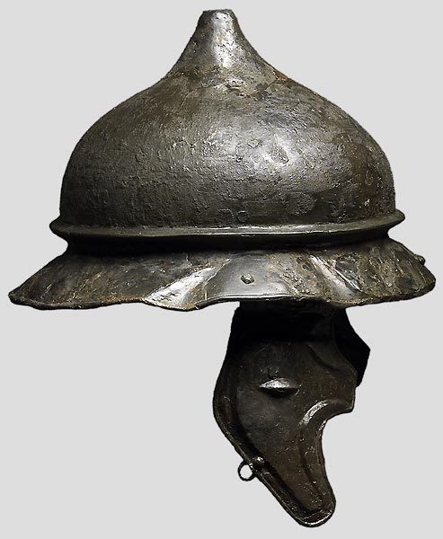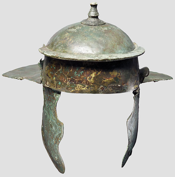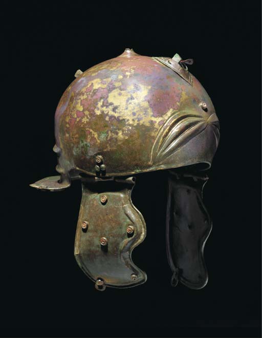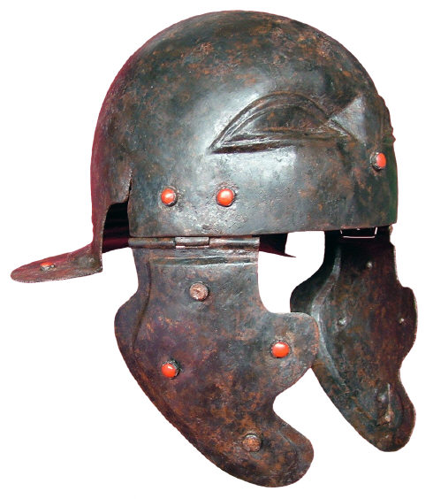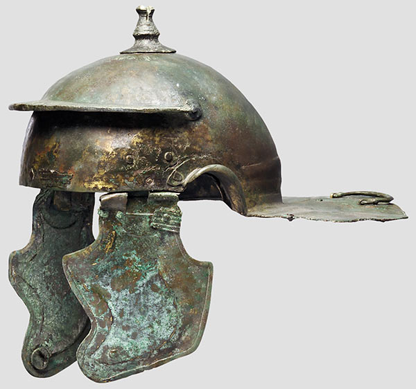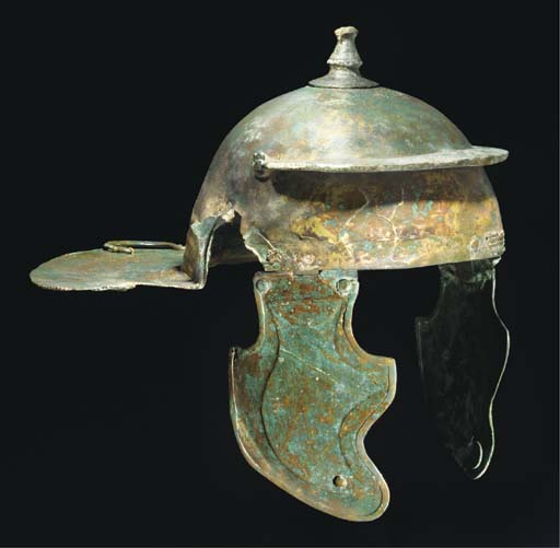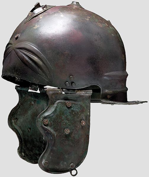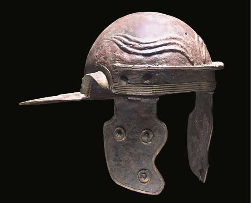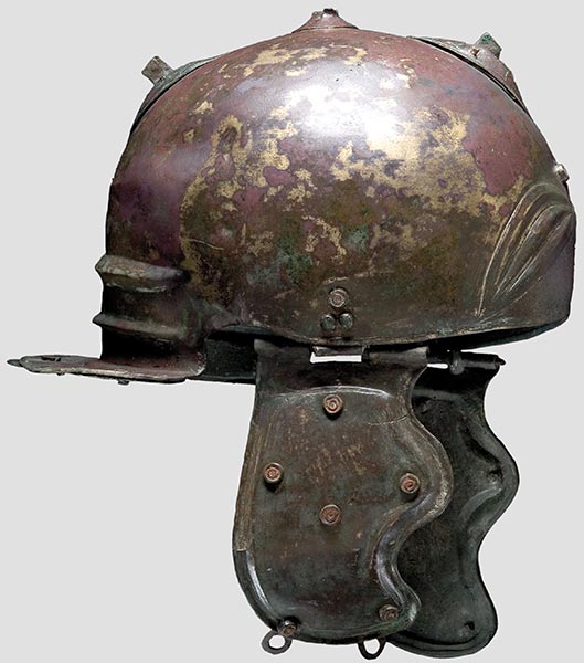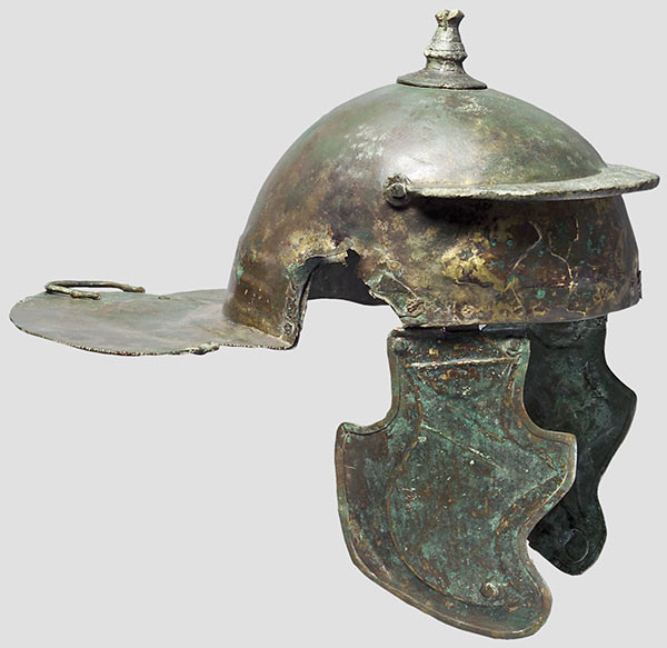 Iron helmet of the sub-type Weisenau/Guttmann (classification by Marcus Junkelmann). For comparison see the tinned example with decorated cheek pieces from the former Axel Guttmann collection (see above picture this section). The iron bowl is completely preserved with both cheek pieces and decorative red enamel studs. Early example of this helmet type attributed to the Augustan/Tiberian period. A-typical "eyebrows" with distinct "celtic" features, previously encountered only in few finds such as a brass helmet in the former Guttmann collection with "hanging eyebrows" (see above picture in this section) and a brass helmet in the collection of the Archaeological Museum Frankfurt.