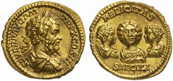 AD), in the Aureus with his wife Julia Domna, and his two sons