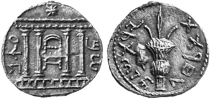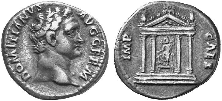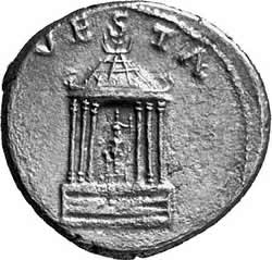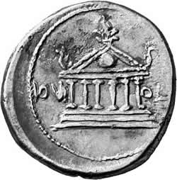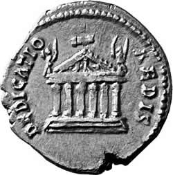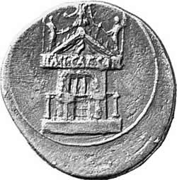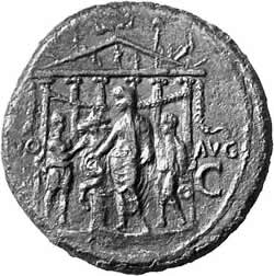 Caligula sacrificing to Divus Augustus in front of 6 columned tempel