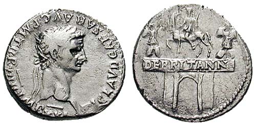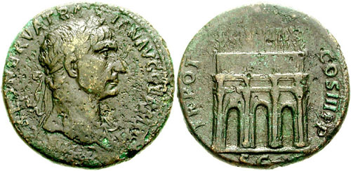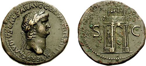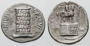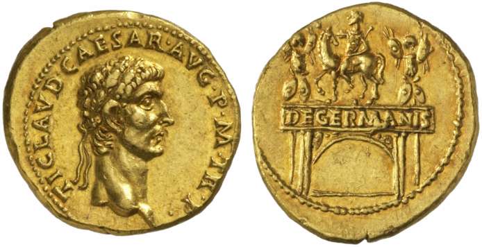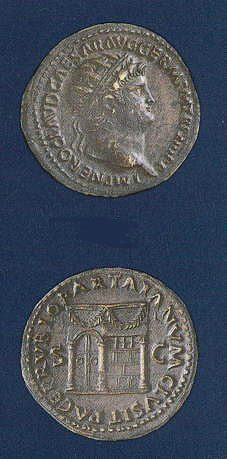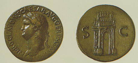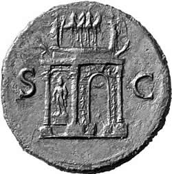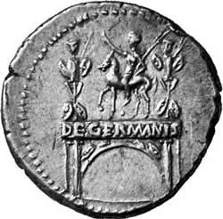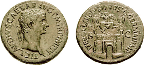 Arch of Drusus for his Germanic victories (on coins of Claudius, left a sestertius, right a denarius)